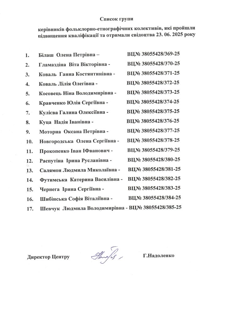 Список групи керівників фольклорно-етнографічних колективів, які пройшли підвищення кваліфікації та отримали свідоцтва 23.06.2025 року
