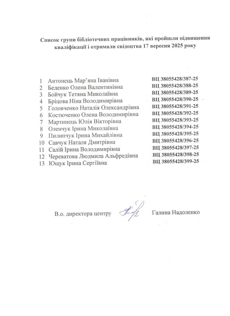 Список групи бібліотечних працівників, які пройшли підвищення кваліфікації і отримали свідоцтва 17 вересня 2025 року