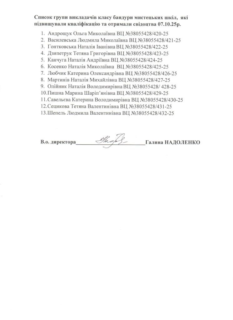 Список групи викладачів класу бандури мистецьких шкіл, які підвищували кваліфікацію та отримали свідоцтва 07.10.25