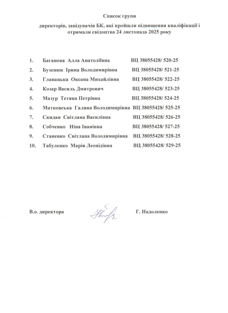 Список групи директорів, завідувачів БК, які пройшли підвищення кваліфікації і отримали свідоцтва 24 листопада 2025 року