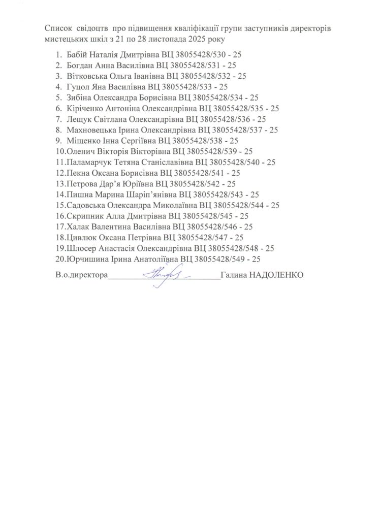 Список свідоцтв про підвищення кваліфікації групи заступників директорів мистецьких шкіл з 21-28.11.2025 року