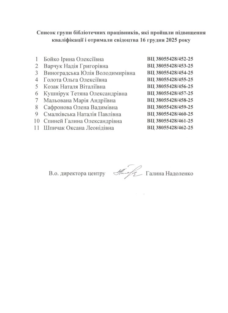 Список групи бібліотечних працівників, які пройшли підвищення кваліфікації і отримали свідоцтва 16 грудня 2025 року
