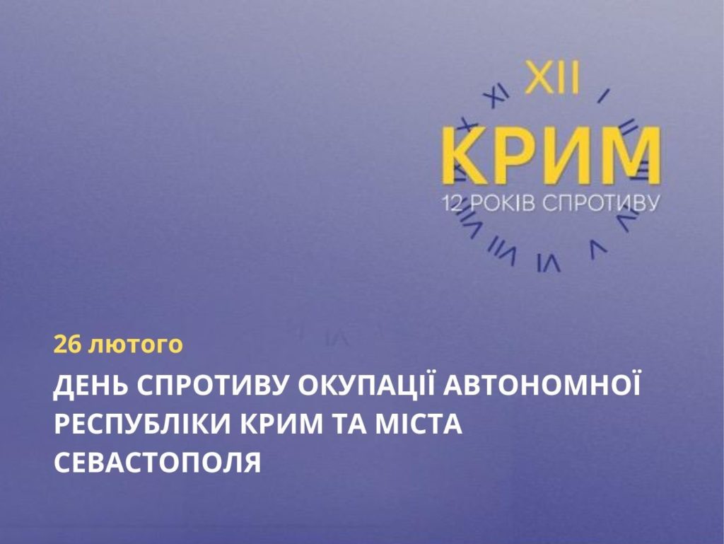 26 лютого 2026 року в Україні відзначатимуть 12 років початку спротиву окупації Криму та початку війни, яку розгорнула Росія проти України. Цей день покликаний згадати та вшанувати мужність тисячі жителів Кримського півострова, які 26 лютого 2014 року вийшли у Сімферополі на мітинг на підтримку територіальної цілісності України. А також всіх, хто продовжував і продовжує чинити опір окупантам на півострові. Адже боротьба триває.