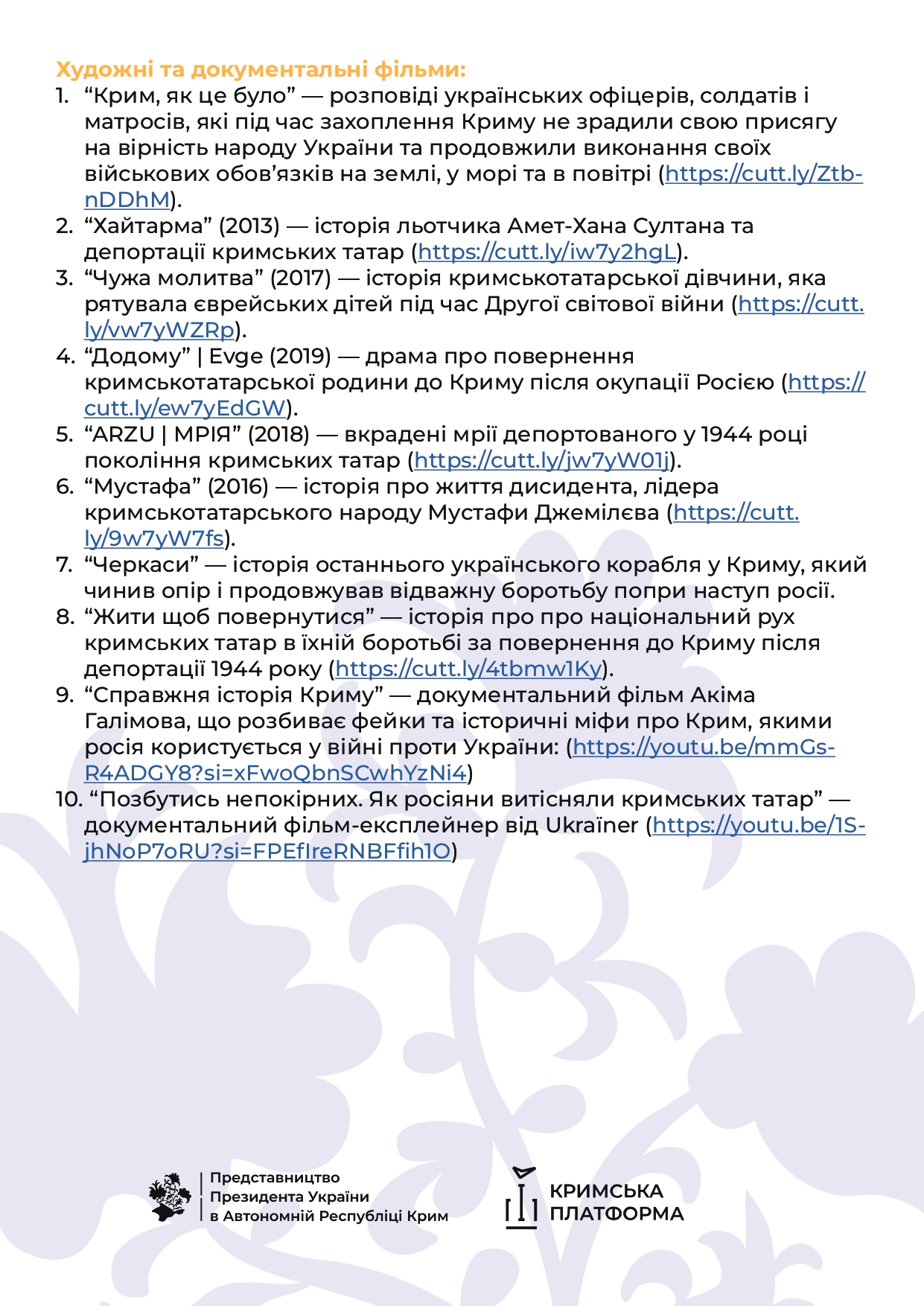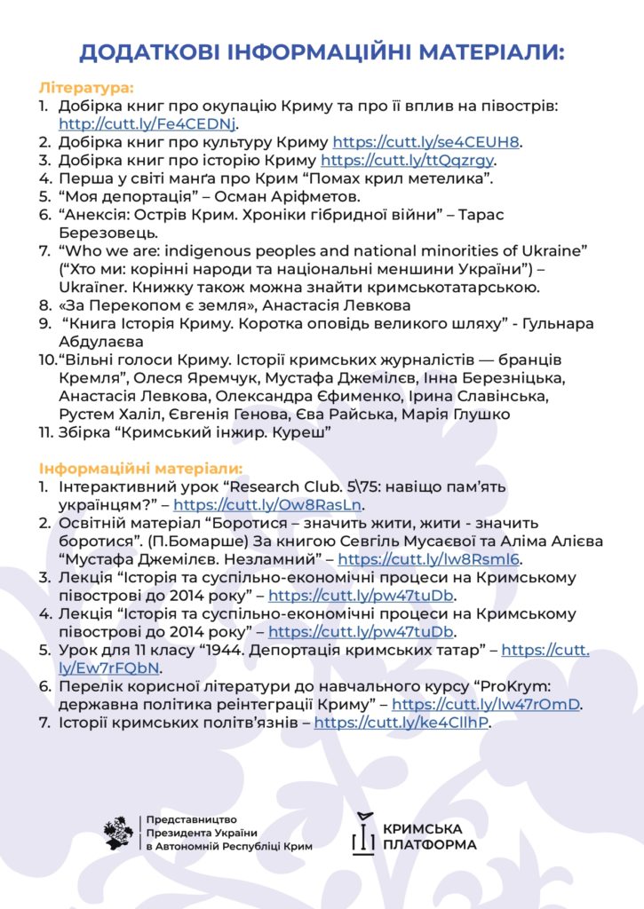 Додаткові інформаційні матеріали: перелік книг, відео, літератури та інших навчальних та просвітницьких матеріалів на тему Криму: https://surl.li/hhdslr