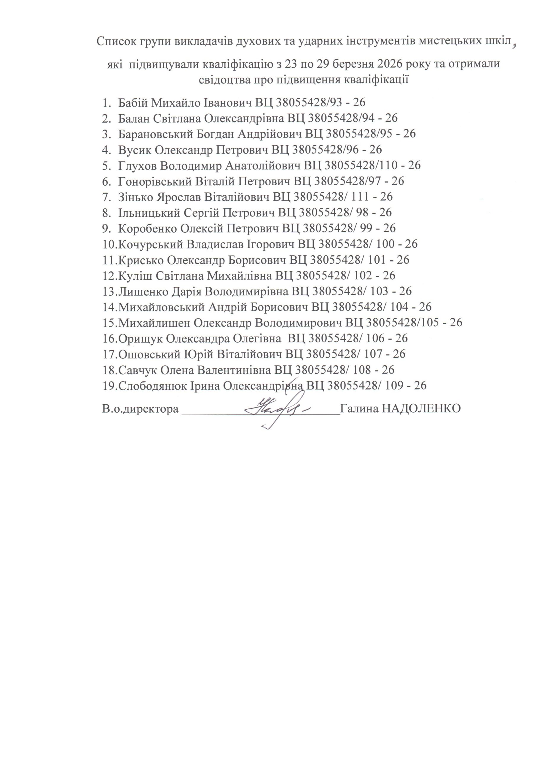 Список групи викладачів духових та ударних інструментів мистецьких шкіл, які підвищували кваліфікацію з 23 по 29 березня 2026 року та отримали свідоцтва про підвищення кваліфікації